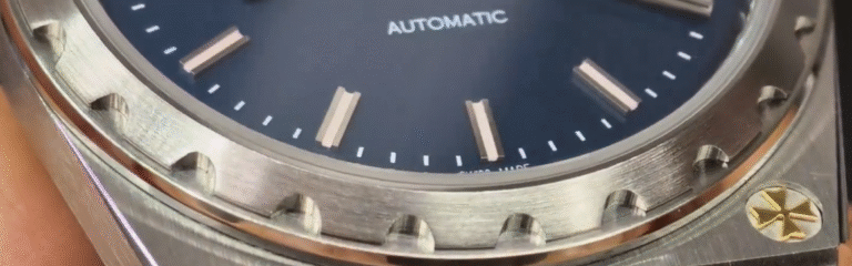 ヒストリーク 222 スーパークローンの真骨頂は、ダイヤルにあります。PPF工場のこのモデルは、マットなブルーダイヤルが特徴ですが、本物のマットテクスチャに比べてやや控えめです。とはいえ、マルタ十字ロゴや中央のピニオンが本物に極めて近く、他の工場製より進化しています。日付窓は完璧に仕上げられ、シルバーフレームの四隅が丸くポリッシュされ、シャープすぎないエレガントさです。黒いオイルプリントの日付フォントは形状が正確で、わずかに立体感があります。