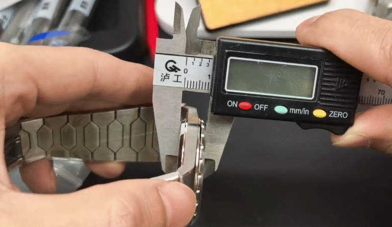 全体写真からもわかるように、ケース直径37mmのコンパクトサイズは細い手首にぴったりです。ラグからラグまでの高さが視覚的にバランスを取ってくれ、小さく見えないのが魅力です。ケース厚は8.5mmと本物よりわずかに厚めですが、日常使いに支障はありません。リューズは非ねじ込み式で、本物と一致しています。