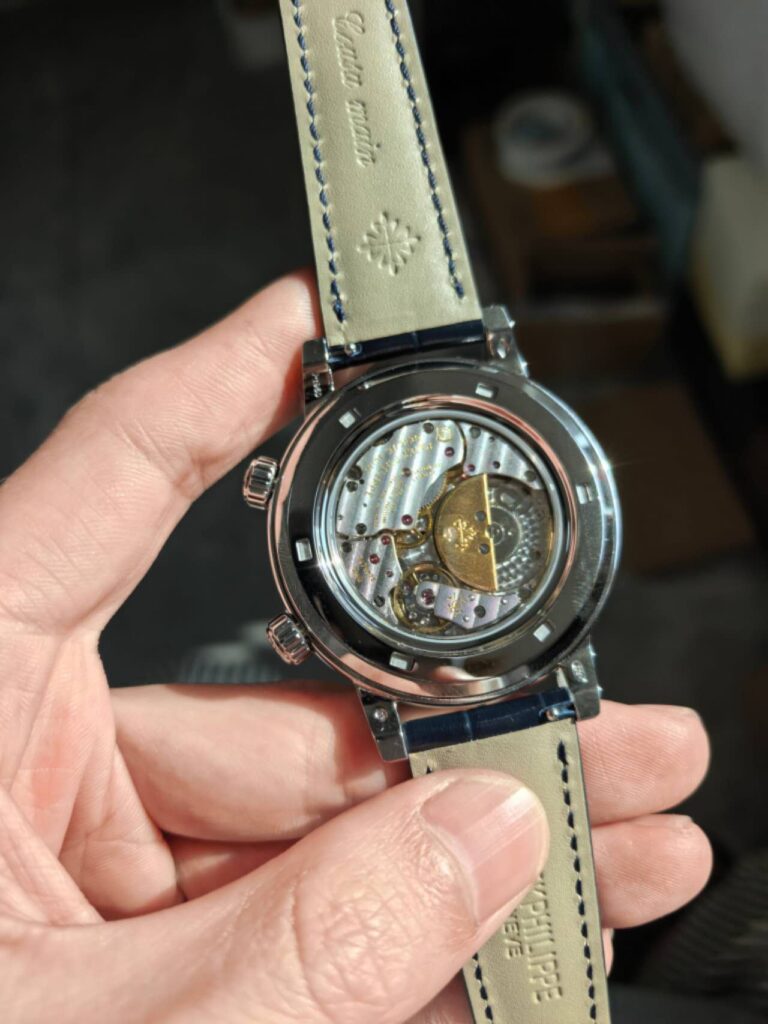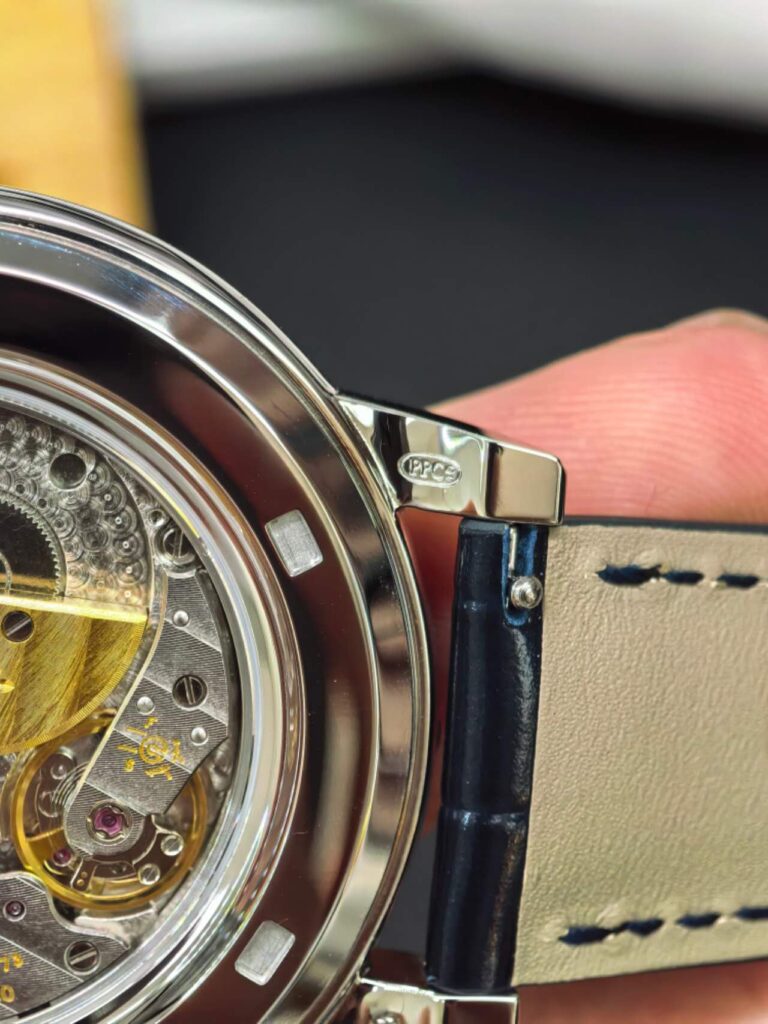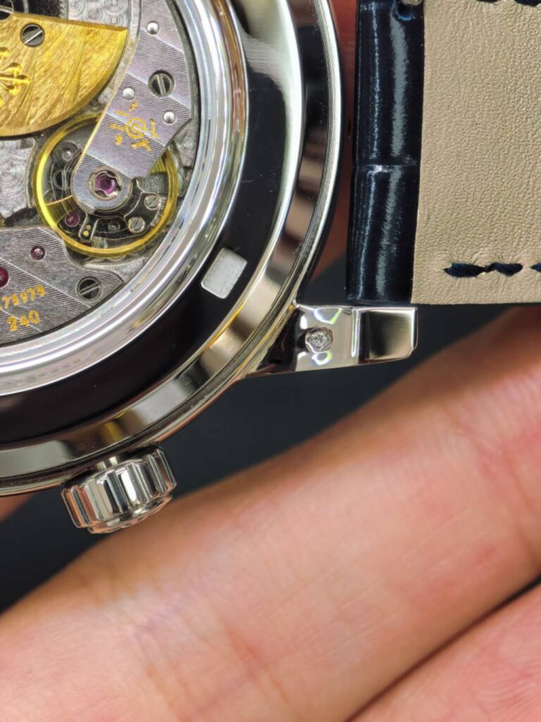 本物との違い(ローターと研磨): 本物のキャリバー240は、巻き上げ効率を高めるためにマイクロローターに「22Kソリッドゴールド」を使用していますが、PPF工場製はゴールドメッキ仕様です。また、本物はムーブメントの縁や角に至るまで完璧な鏡面仕上げが施されており、レプリカと比較すると全体的な輝きが異なります。